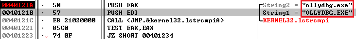 0x0040121A 주소에 브레이크 포인트를 설정하고 (F9) 단축키를 누르다 보면 위와 같이 실행 중인 올리디버거 "ollydbg.exe" 문자열과 "OLLYDBG.EXE" 문자열을 비교한다.