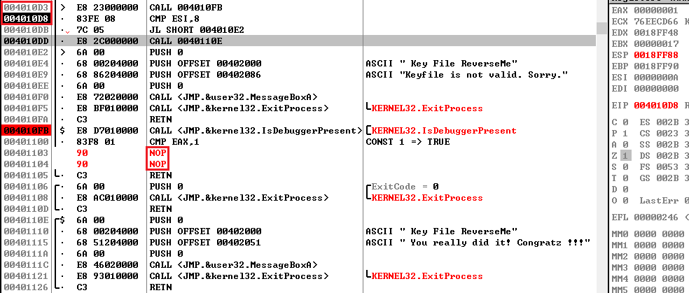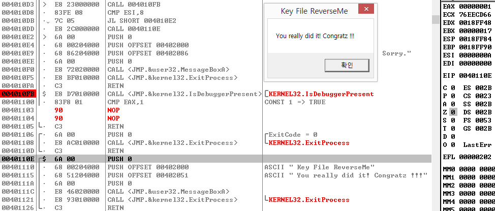 따라서 IsDebuggerPresent 함수의 반환 값에 상관 없이 리턴하도록 NOP 명령어로 패치해주자. 그럼 리턴 주소인 0x004010D8 주소로 돌아갈 것이다.