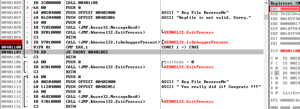디버깅중이기 때문에 IsDebuggerPresent 함수의 반환 값은 0x1 값이다. 0x00401100 주소의 CMP EAX, 1 명령어와 다음 명령어인 JE SHORT 004010E2 명령어 때문에 [사진 1-4]의 메시지 박스가 뜨는 것이다.
