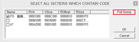 그럼 위와 같이 사용되는 영역이 나오는데 첫 번재 영역만 선택하고 Full Dump 버튼을 클릭한다.