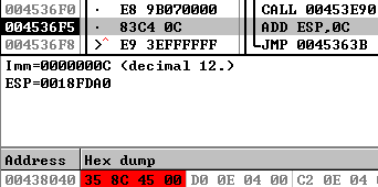 0x00438040 주소의 값일 때는 0x004536F8 주소로 점프하지 않고 0x004536F0 주소의 CALL 명령어에 의해 0x00453E90 함수가 호출된다.