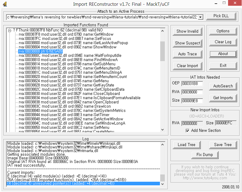 라고 생각했지만 Import REC 도구로 확인해보니 몇 가지 함수의 주소가 정상적으로 복구되지 않았다. 복구되지 않는 함수들이 어떤 것들인지 알아냈지만 IAT를 복구하는 과정에서 패커에 의해서 복구되지 않는 것인지 아니면 실습 환경에 의해 복구되지 않는 것인지는 알아내지 못했다.