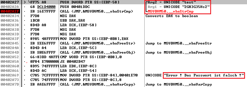 password 값으로 "test" 문자열을 입력하고 파일을 실행하자. 그리고 "Error! ~~" 문자열이 사용되는 루틴을 보면 vbaStrCmp 함수로 내가 입력한 "test" 문자열과 "2G83G35Hs2" 문자열을 비교한다.