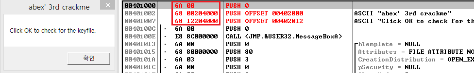사용 도구: 올리디버거 2.01 abex` 3rd crackme(이하 원본파일)를 풀어보자. 먼저 원본파일을 실행시키면 다음과 같은 메세지 박스가 뜬다. keyfile을 체크하라는 내용의 메시지 박스와 file을 찾을 수 없다는..