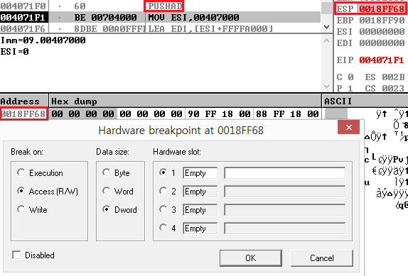 원본파일을 올리디버거로 열면 PUSHAD 명령어로 레지스터 값들을 스택에 저장한다. 언패킹되고 OEP로 점프하기 전에 POPAD 명령어로 레지스터 값을 복구할 것이기 때문에 ESP 레지스터의 값에 하드웨어 브레이크 포인트를 설정하자.