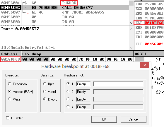 올리디버거로 파일을 보면 PUSHAD 명령어를 수행한다. OEP로 점프하기 전에 POPAD 명령어가 수행될 것이기 때문에 ESP 레지스터의 값에 하드웨어 브레이크 포인트를 설정한다.