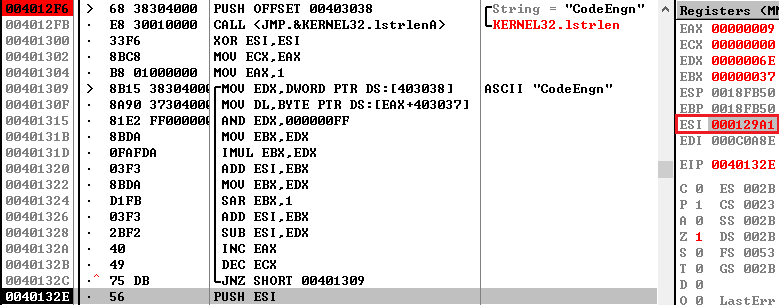 반복문은 간단하기 때문에 따로 쓰지는 않겠다. 게다가 코드엔진에서 Name을 "CodeEngn"으로 고정했기 때문에 결과 값만 알면 된다. 반복문이 끝나면 ESI 레지스터에 0x129A1 값이 저장된다.