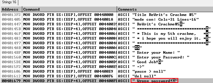 "Wrong password!" 문자열이 사용되는 루틴을 보면 0x0040159F 주소에서 EAX 레지스터의 값과 EBP-0x3C 지점의 값을 비교해서 다르면 "Wrong password!" 문자열이 출력된다. 따라서 디버거에서 파일을 실행하고 패스워드를 입력하면 올바른 패스워드를 알 수 있다.