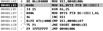 디버거로 파일을 열어보면 어셈블리 명령어들이 복잡해보인다. 4011AE 주소로 점프하고 있다.