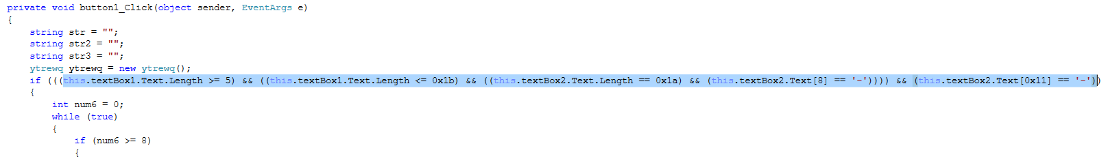 파일을 까보면 Name, Serial을 비교하고 있다. Name 값의 경우 길이가 0x5~0x1b이고, Serial 값의 경우 길이는 0x1a이다. 그리고 Serial 값의 9번째 값과 18번째 값은 '-' 문자여야 한다. 코드엔진 문제에서 제시한 Name이 "CodeEngn" 값이고 Serial이 "28BF522F-A5BE61D1-XXXXXXXX" 값이므로 X 값들을 찾으면 된다.