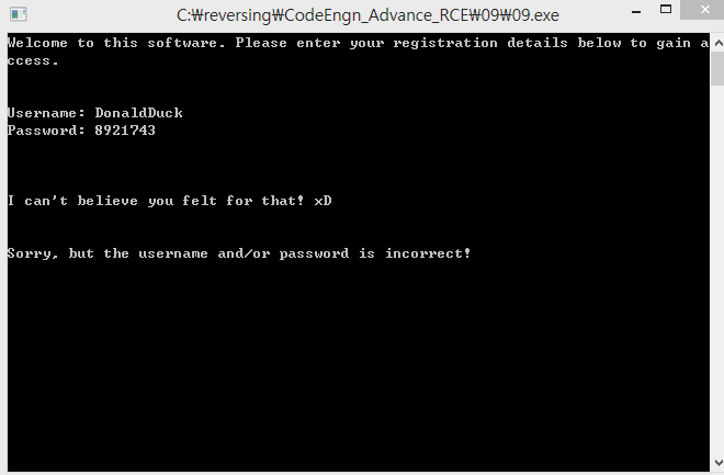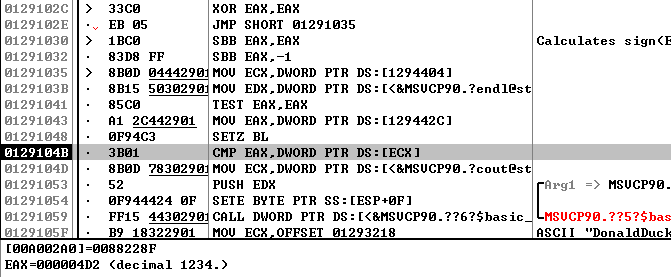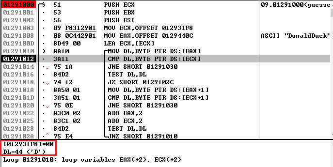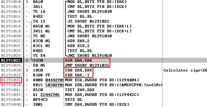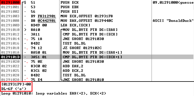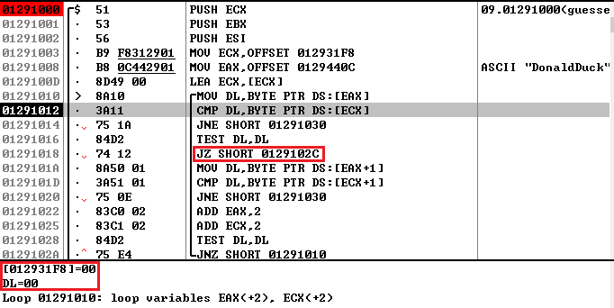 그럼 0x0129102C 주소로 점프하고 EAX 레지스터의 값을 0으로 초기화한다. 그리고 0x01291035 주소로 점프하여 입력한 Password를 검사한다. Username이 널문자가 아닐 때는 EAX 레지스터의 값이 SBB 명령어에 의해 0이 아니게 되고, EAX 레지스터의 값에 따라 성공/실패 메시지가 출력되는 것이다.