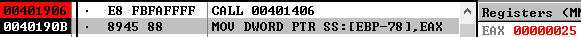 이제 0x00401406(stringFindSecond) 함수가 두 번째로 호출되는 곳을 보면 전달되는 첫 번째 인자는 [사진 10]에서 확인한 문자열이다. 두 번째 인자는 내가 입력했던 Name의 첫 번째 값이다.
