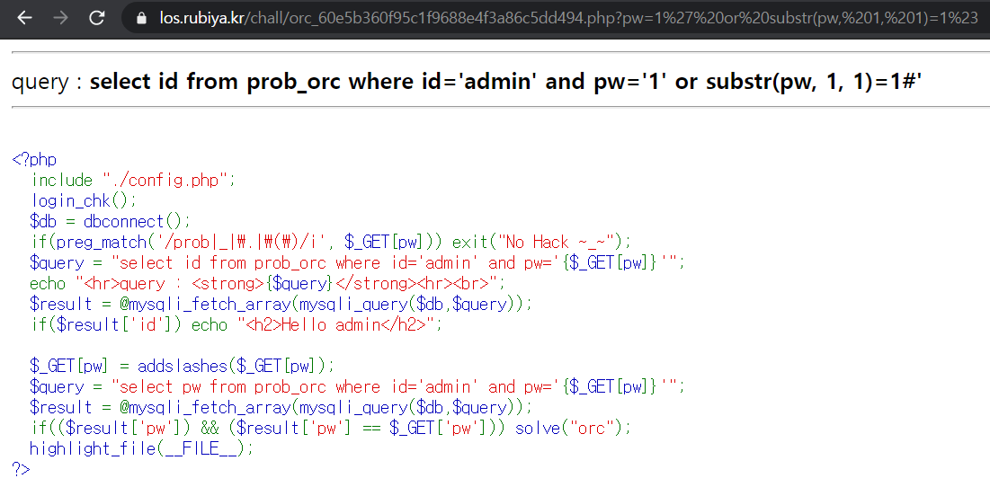$query = "select pw from prob_orc where id='admin' and pw='{$_GET[pw]}'";