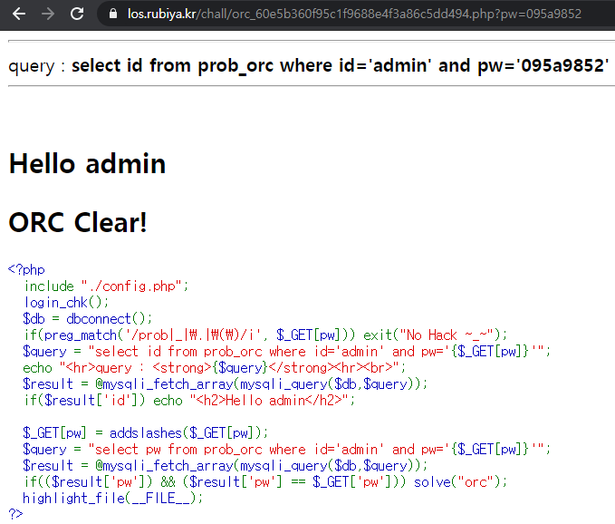위와 같이 pw 값으로 "1' or '1'='1" 문자열을 전달하면 쿼리문을 우회하여 admin 데이터를 가져올 수 있다. 하지만 입력한 pw 값이 데이터베이스 상의 pw 값이 아니므로 orc 문제가 clear 되지는 않는다.