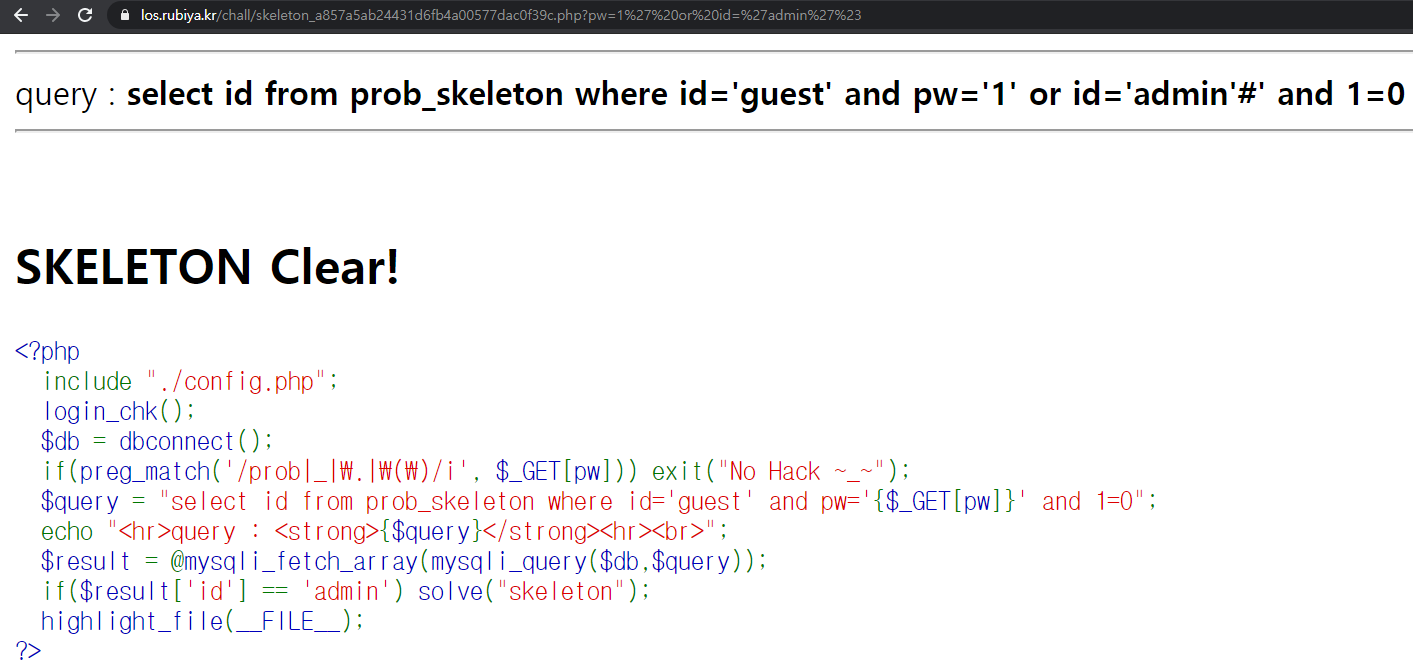 $query = "select id from prob_skeleton where id='guest' and pw='{$_GET[pw]}' and 1=0";