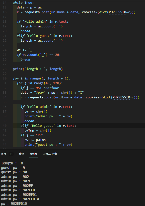 쿼리문에서 pw 값을 single quote로 감싸고 있기 때문에 pw를 escape하기 어렵다. pw 값을 추측해야 하는데, equal("=") 명령어가 아닌 like 명령어를 사용하고 있으므로 무작위 대입을 하면 된다. like 명령어의 "_" 와일드카드로 pw 값의 길이를 알아내고 "%" 와일드카드로 pw 값을 추측하면 된다.