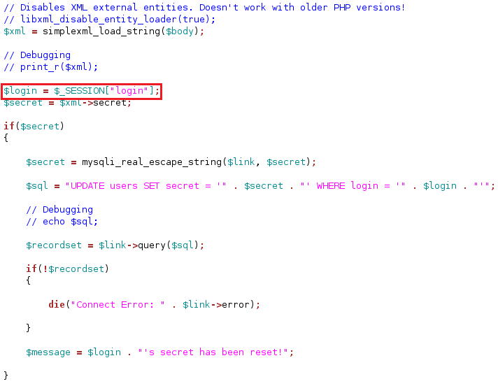 low 레벨이다. 먼저 웹페이지에서 "Any bugs" 버튼을 클릭하면 ResetSecret() 함수가 실행된다. ResetSecret() 함수는 위와 같이 xxe-2.php에 파라미터로 login, secret 값을 보낸다.