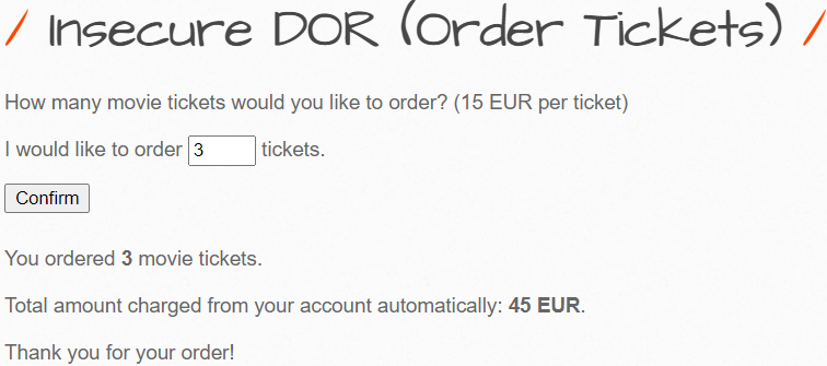 high 레벨이다. medium 레벨과 마찬가지로 body에 ticket_price 파라미터가 존재하지 않아 임의로 값을 설정하였지만 위와 같이 티켓 가격이 변조되지 않고 총 45 유로가 지불되었다.