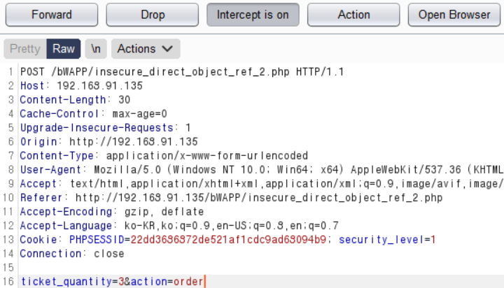 medium 레벨이다. burp로 프록시를 잡으면 low 레벨과 다르게 ticket_price 파라미터가 보이지 않는다. 서버에서 디폴트로 설정되어 있는지 모르겠지만, 임의로 body에 ticket_price 파라미터 값을 추가해보자.