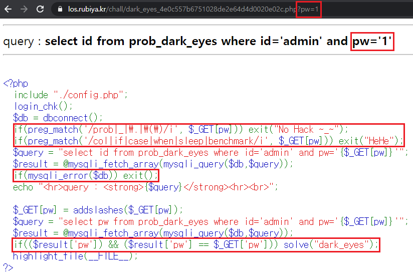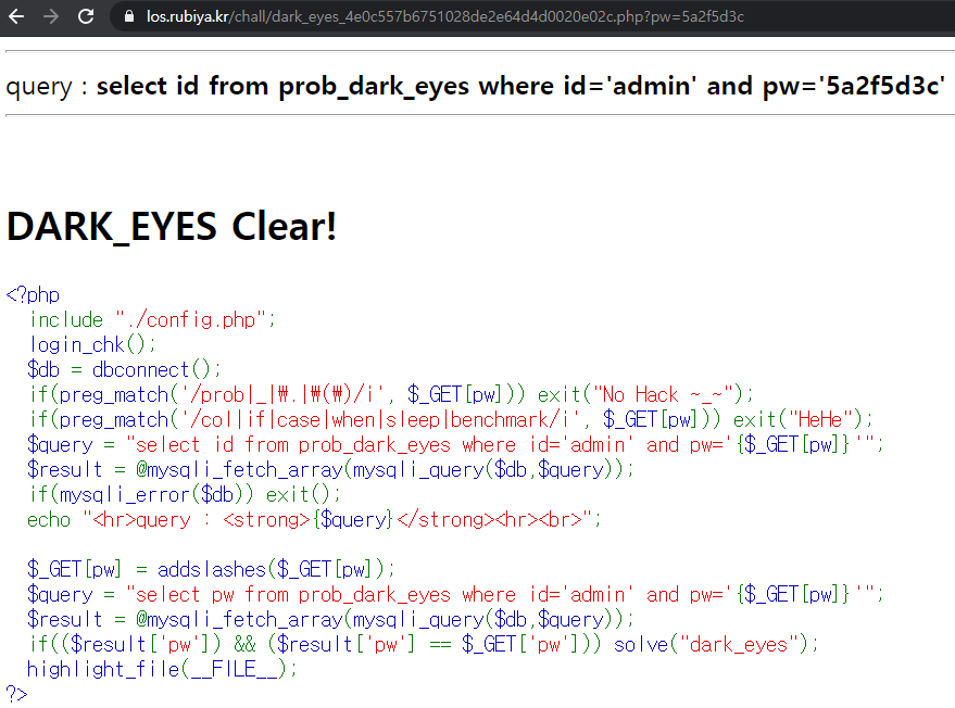 if(($result['pw']) && ($result['pw'] == $_GET['pw'])) solve("dark_eyes");