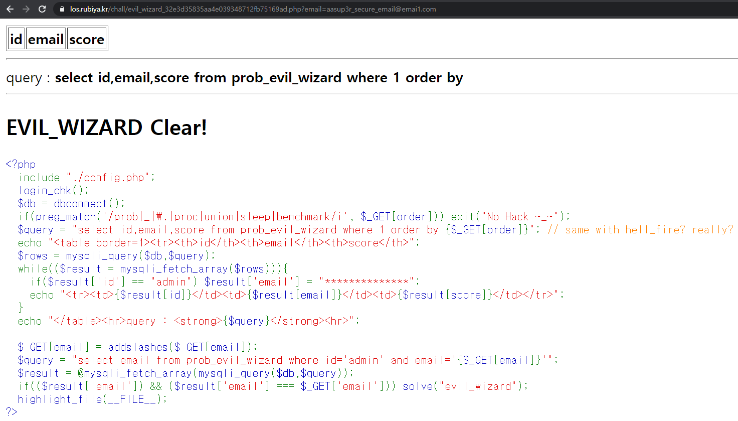 $query = "select id,email,score from prob_evil_wizard where 1 order by {$_GET[order]}"; // same with hell_fire? really?