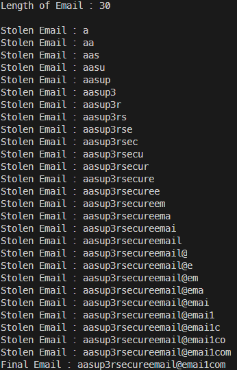 위와 같이 email 길이, 값을 탈취할 수 있다. 이전 문제와 마찬가지로 order 파라미터에 SQL Injection을 수행하는데, "_", "." 문자가 필터링되기 때문에 실제 길이인 30보다 작은 27글자가 탈취된다. 정확한 email은 "aasup3r_secure_email@emai1.com"이다.