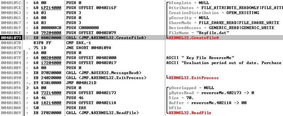 또는 위와 같이 CreateFileA 함수가 반환하는 값에 상관없이 즉, "Keyfile.dat" 파일이 없어도 40109A 주소의 ReadFile 함수로 무조건 점프하도록 패치할 수 있다. 이렇게 패치하고 더 진행해보자.