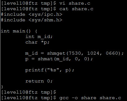 그리고 파일을 실행하여 공유 메모리를 생성해주고 해당 영역을 출력해주면 level11 계정의 password를 확인할 수 있다.