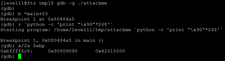 위와 같이 gdb를 통해 임의의 값 "\x90"을 268개 넣어주면 ebp까지 "\x90" 값으로 변조된 것을 확인할 수 있다.