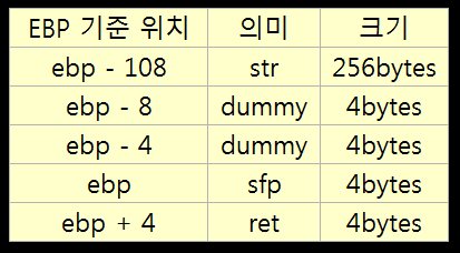 따라서 스택은 위와 같이 형성될 것이다. str 변수부터 ebp까지의 크기는 268bytes이다.
