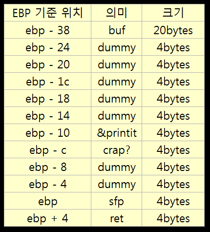 스택은 위와 같이 형성될 것이다. buf 변수부터 &printit 함수 주소 직전까지의 크기는 40bytes이다.
