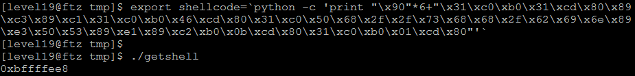 그 다음 임의의 값 "\x90"을 44개 입력하여 ebp까지 변조시키고 shellcode의 주소를 입력하면 ret는 변조되어 level20 계정의 권한으로 setreuid 함수를 호출한 후 쉘이 실행될 것이다. 그리고 my-pass 명령어로 level20 계정의 password를 확인할 수 있다.