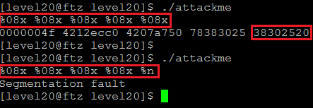 위와 같이 attackme 파일을 실행하고 %08x 포맷스트링을 5번 반복하여 출력된 값은 총 20bytes의 값이다. 다시 %08x 포맷스트링을 4번 반복하고 %n 포맷스트링을 입력하면 Segmentation fault가 일어난다. 왜냐하면 %n 포맷스트링은 %n이 나오기 전까지의 출력된 값들의 bytes 크기를 다음에 나오는 주소에 bytes 수만큼 저장한다.