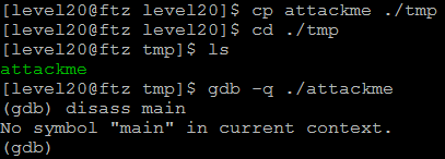 일단 attackme 파일을 /home/level20/tmp/ 디렉터리에 복사하고 gdb로 main 함수의 어셈블리어 코드를 확인해보려 하였다. 그러나 막혀있다. 따라서 bleh 변수가 ebp로부터 얼마나 떨어져 있는지 알기 어렵다.