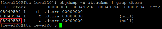 .dtors 영역은 위와 같이 objdump 명령어로 찾을 수 있는데 0x08049598에 shellcode의 주소를 입력해주면 된다.
