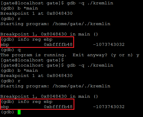 그 다음 gdb로 복사된 파일을 실행시켜서 ebp를 확인하면 고정적인 것을 알 수 있다. 따라서 shellcode를 buffer 변수에 입력하고 리턴 주소를 buffer 변수 주소로 변조시키면 shellcode가 실행될 것이다.