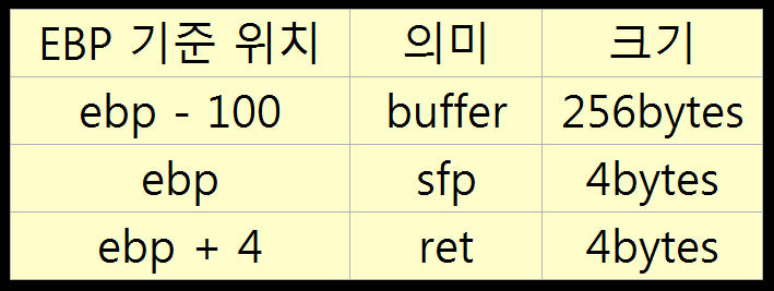 따라서 스택은 위와 같이 형성될 것이고, 260bytes를 입력하면 ebp까지 변조가 가능하다.