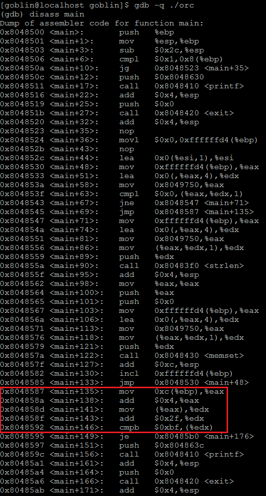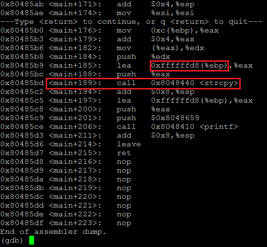 main 함수의 어셈블리어 코드를 보면 main+135 ~ main+146 구간이 argv[1][47]이 "\xbf"인지를 확인하는 곳이다. 그리고 main+189의 strcpy 함수를 호출하기 전에 ebp-0x28 주소를 eax 레지스터에 저장하고 있다. 즉, 이 곳이 buffer 변수의 시작점이다.