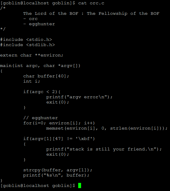 주어진 코드를 보면 환경변수를 모두 0으로 초기화한다. 따라서 환경변수에 shellcode를 입력하여 ret를 변조하는 것은 불가능하므로, argv 인자에 shellcode를 입력해야 한다. 그런데 argv[1][47] != "\xbf" 이면 프로그램을 종료하고 있다.