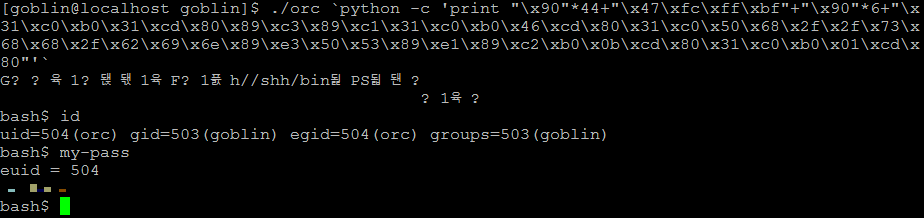 따라서 위와 같이 임의의 값 "\x90" 44bytes로 ebp까지 변조하고 ret는 [사진 6]에서 확인한 shellcode 주소인 0xbffffc46 + @로 변조하자. 그리고 shellcode를 추가로 입력해주면 변조된 ret는 shellcode를 실행할 것이다. 사용한 shellcode는 다음과 같고, setreuid 함수가 포함되었다.