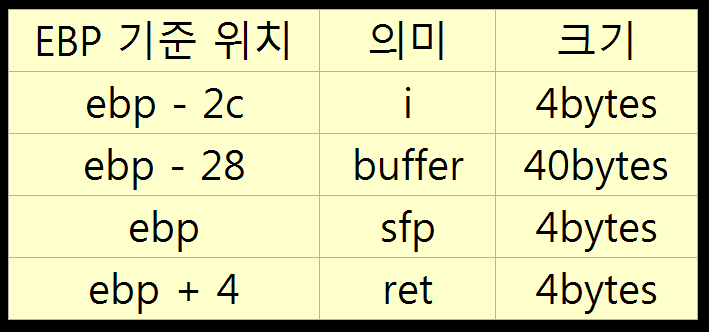 따라서 스택은 위와 같이 형성될 것이고 argv 인자를 통해 44bytes를 입력하면 ebp까지 변조할 수 있다.
