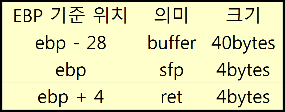 따라서 스택은 위와 같이 형성될 것이고, buffer 변수부터 44bytes를 입력하면 ebp까지 변조할 수 있다.