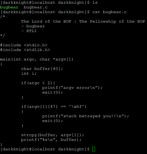 이전 문제들과는 달리 첫 번째 인자의 48번째 값이 "\xbf"이면 프로그램을 종료시킨다. 아래에서 확인하겠지만 첫 번째 인자의 48번재 값은 ret 주소이다. 즉, ret를 변조할 값으로 0xbf로 시작하는 값을 쓸 수 없다는 것이다.