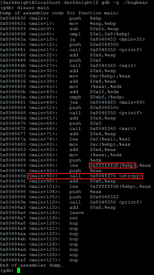 main 함수의 어셈블리어 코드를 보면 strcpy 함수를 호출하기 전에 ebp-0x28 주소를 eax 레지스터에 저장한다. 즉, 이 곳이 buffer 변수의 시작점이다.