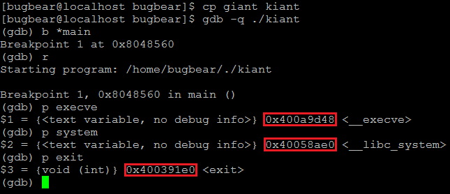 위와 같이 giant 파일을 다른 이름(kiant)으로 복사해주고 gdb로 실행하면 된다. main에 브레이크 포인트를 설정하고 p 명령어로 execve 함수와 system 함수, exit 함수의 주소를 확인할 수 있다.