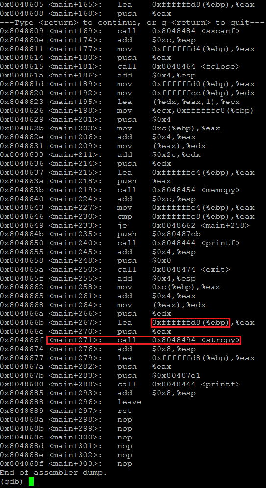 main 함수의 어셈블리어 코드를 보면 strcpy 함수를 호출하기 전에 ebp-0x28 주소를 eax 레지스터에 저장한다. 즉, 이 곳이 buffer 변수의 시작점이다.
