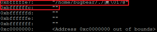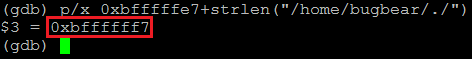 위와 같이 "/bin/sh" 문자열이 파일명인 절대경로 파일의 주소 0xbfffffe7을 찾을 수 있다. 그리고 NULL 값의 주소 0xbffffffc도 찾을 수 있다.