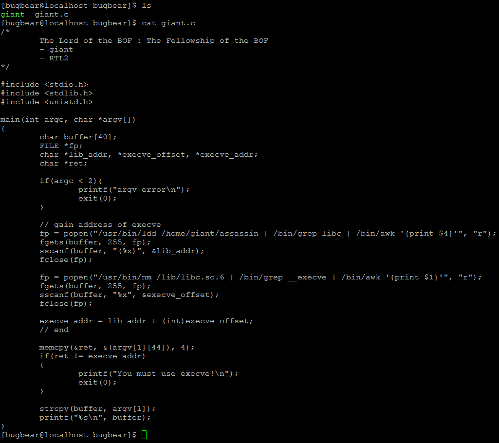 다음으로 giant 파일로 "/bin/sh" 문자열의 주소를 파일명으로 하는 심볼릭 링크 파일을 만들어준다. 임의의 값 "\x90" 44bytes로 ebp까지 변조시키고 execve 함수의 주소로 ret를 변조한다. 그리고 execve 함수의 ret가 될 ebp+8 지점을 exit() 함수의 주소로 변조하고 execve 함수의 인자들을 입력한다. 그러면 위와 같이 giant 계정의 password를 확인할 수 있다.
